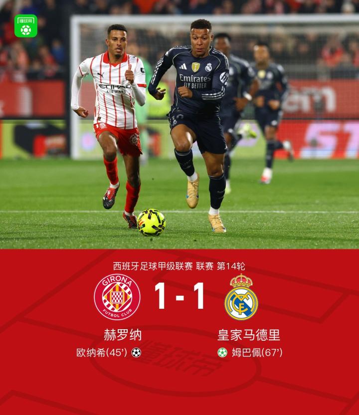 北京时间12月1日,西班牙足球甲级联赛第14轮的较量中,赫罗纳坐镇主场迎战皇家马德里,这场本被寄予厚望的强强对话,最终却以皇马1-1战平赫罗纳收场。上半场,齐甘科夫送出精妙助攻,欧纳希抓住机会打破僵局;下半场,维尼修斯制造点球,姆巴佩主罚命中。然而,皇马却遭遇了西甲联赛3连平的尴尬局面,联赛领头羊的位置也被巴萨无情取代,如此表现实在难以让球迷满意。